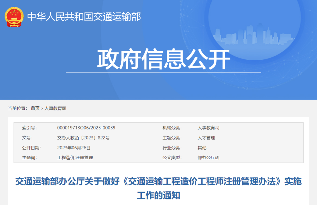 2023年4月23日,交通运输部颁布了《交通运输工程造价工程师注册管理办法》(交通运输部令2023年第2号,以下简称《办法》),将于8月1日正式实施。为做好《办法》实施工作,经交通运输部同意,现将有关事项通知如下: